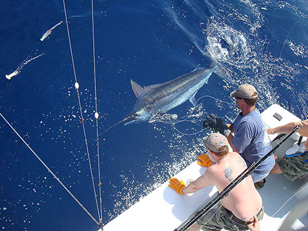 We usually catch 15 – 20 per year so it is truly a catch of a lifetime. Average weight is around 300 pounds but it's not unusual to see a 400 to 500 pounder. Catching a Blue Marlin is always a "catch and release" unless tournament fishing.