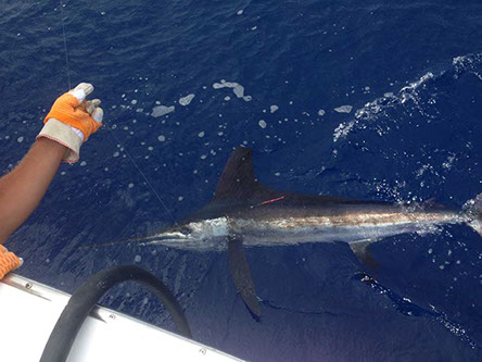 It is the smaller version to the Blue Marlin but they are a blast to catch. When they come after both teasers with their peck fins lit up bright blue excitement is a guarantee. They are a challenge to hook but usually jump all over the ocean when they are hooked.