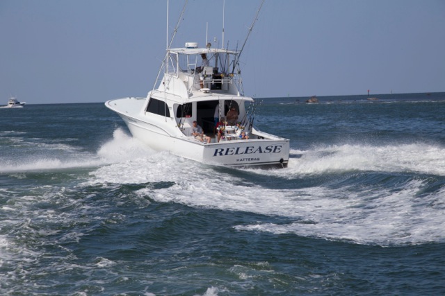 The RELEASE is a 53' Bobby Sullivan powered by a new 60 Series Detroit diesel, while producing no smoke, provides plenty of speed to give you more fishing time. Fully equipped with the latest in Penn tackle; 12 lb to 130 lb, stand up or conventional and updated jigging and spinning tackle. The Release is air-conditioned, equipped with up-to-date electronics, Sirius radio and all Coast Guard required safety equipment. If you or your family and friends are looking for a fun day of offshore fishing on the Outer Banks of North Carolina then give Captain Rom Whitaker and his mate on the RELEASE a try. Corporate, family and tournament bookings can be accommodated. Excellent year round fishing: blue marlin, white marlin, sailfish, dolphin, yellow fin tuna, giant blue fin tuna, black fin tuna, wahoo, king mackerel, red drum and striped bass. Also all kinds of bottom fish including barracuda, amberjack and other species. Call (252-986-1031 or 252-216-6160) or email (Contact Us above) for additional information and pick a season for your favorite species.